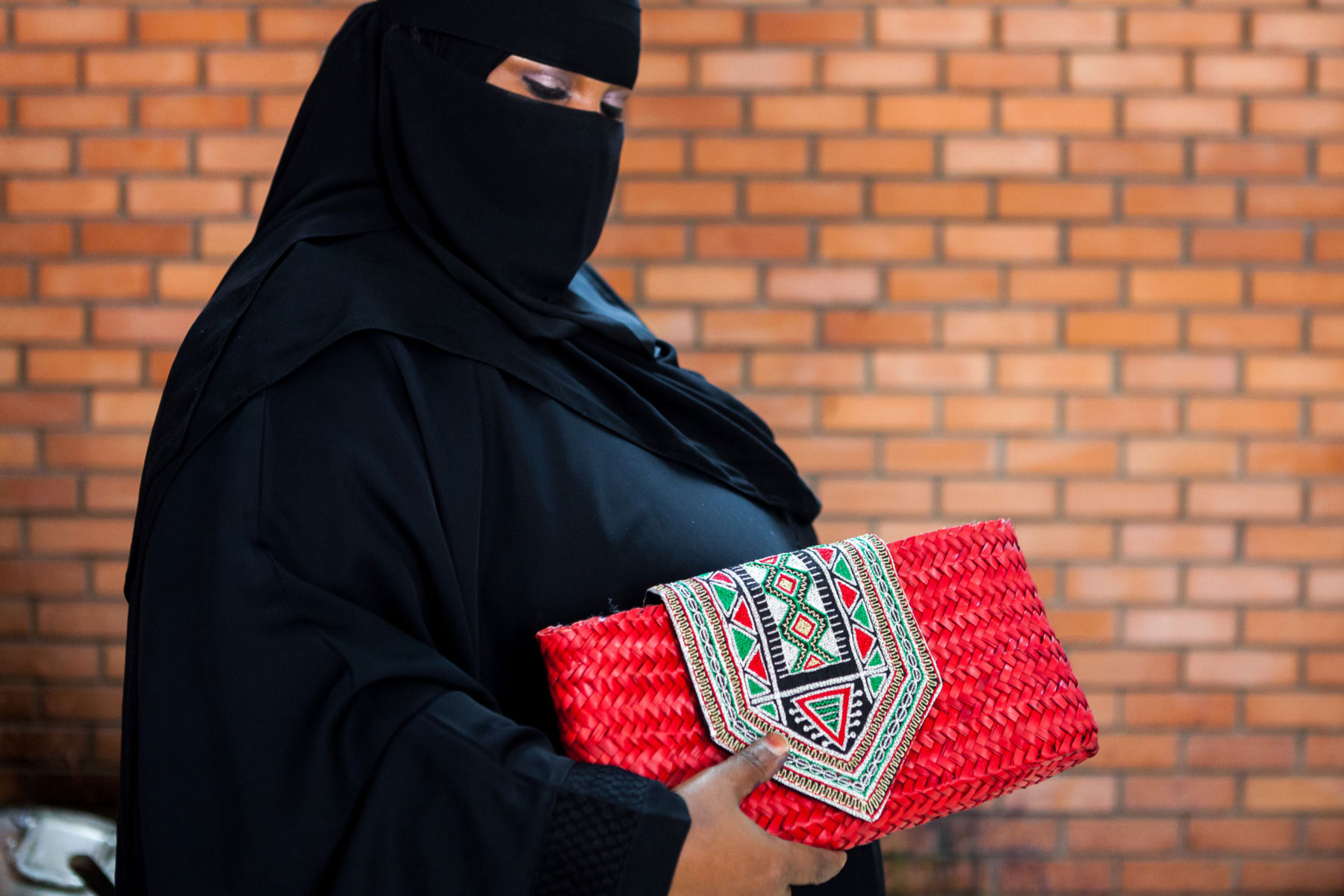 Opposite her on the other side of the table stands Saada Al Harbi, one of Sleysla’s artisans. She comes from a village outside Mecca, where not long ago most people worked with khos, traditional palm leaf weaving.